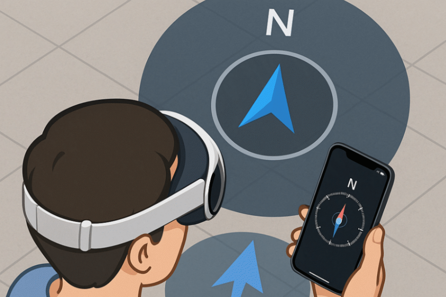 コンパス機能がないVision Proの弱点を補うため、iPhoneと通信連携して位置と方角を取得し、MR空間上に東西南北や目的地の方向を直感的に可視化する空間コンパスアプリです。