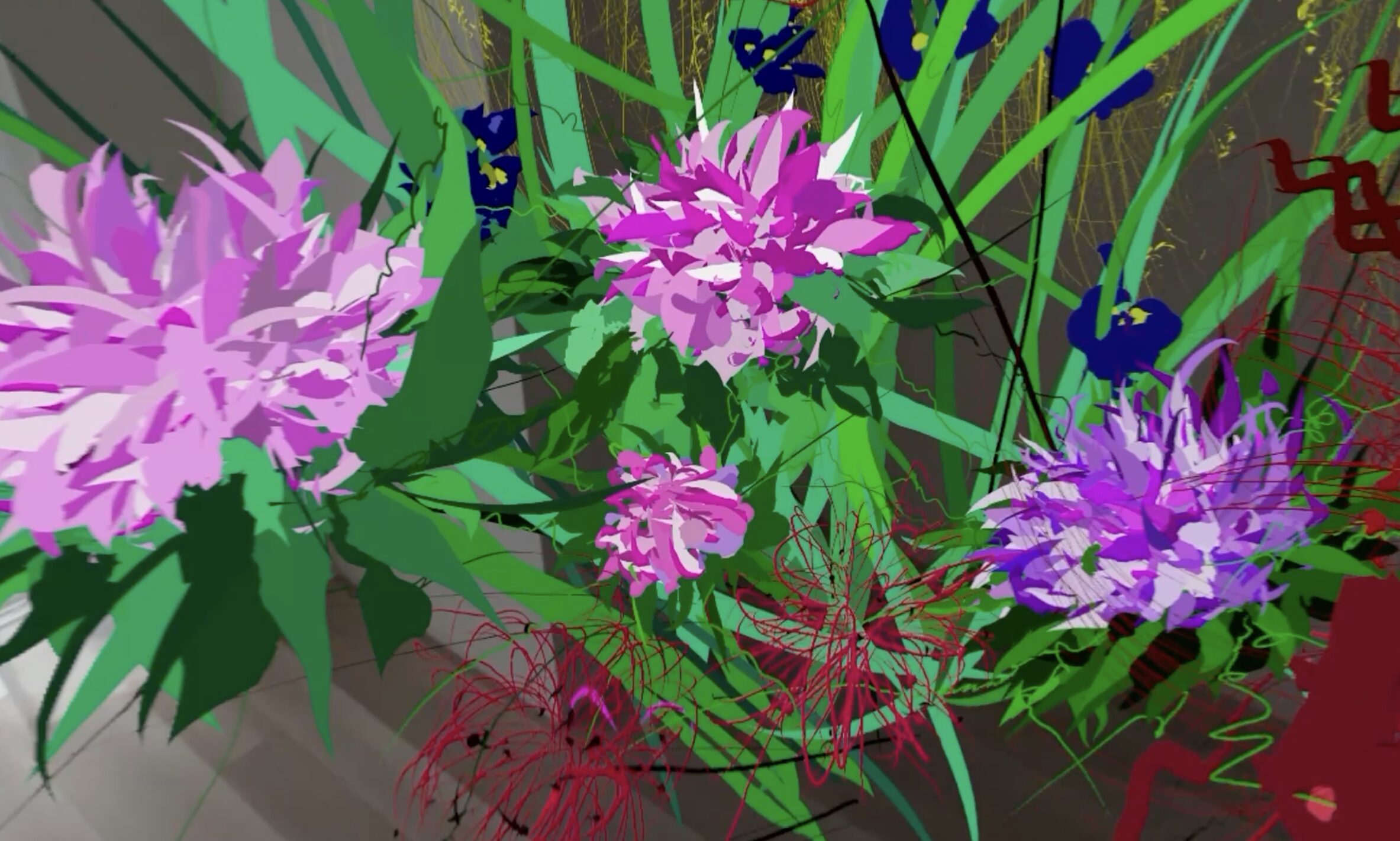 Apple Vision Pro に繰り広げられる 花々と書の饗宴 空間に織りなす花の彩りと 宙に舞う書の流麗な線 繊細かつ優雅な美 MAKI〜Virtual Reality Elegance