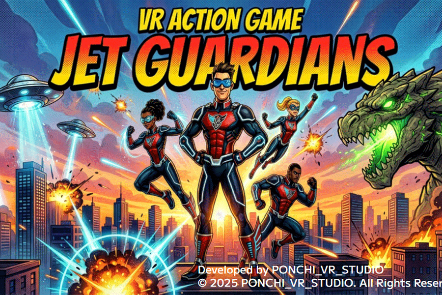 Meta Quest向けの協力型VRヒーローアクション。パンチや掴み、飛行で街を駆け巡り、火事・瓦礫・怪獣・UFOなどの事件を仲間と解決し、スターでMVPも競う。