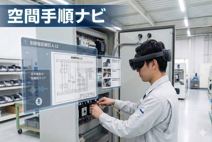 製造現場などで手がふさがっていても、音声で手順書のキーワードを伝えるだけで、AIが必要な書類を検索し、空間に表示できます。
